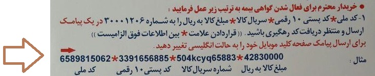همانطور که در برگه برای مشتری توضیح داده شده از سمت چپ به راست شروع کرده اول کدملی و بعد ستاره * و کدپستی 10 رقمی و بعد ستاره * و شماره سریال کالا و در اخر ستاره * و مبلغ کالا به ریال را در یک پیامک نوشته و به شماره 30001206 پیامک کنید .